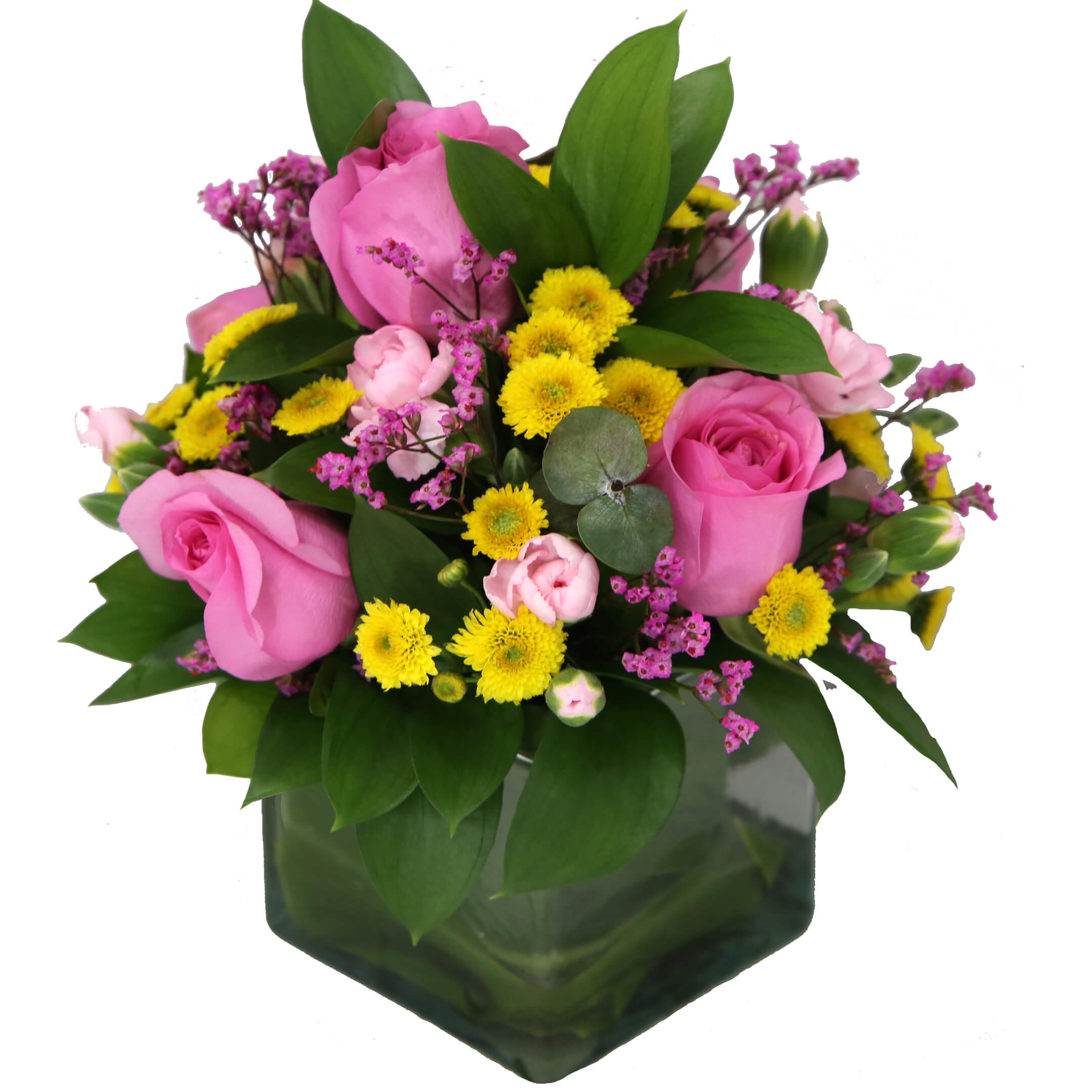 5 Roses, 16 Laterals Buttons/Novelty Poms, 8 Laterals Mini Carnations, 7 Laterals Limonium/Caspia/Gyp/Solidago Natural, 12 Laterals Ruscus & 0.5 Aralia (to cover foam). Glass Container.