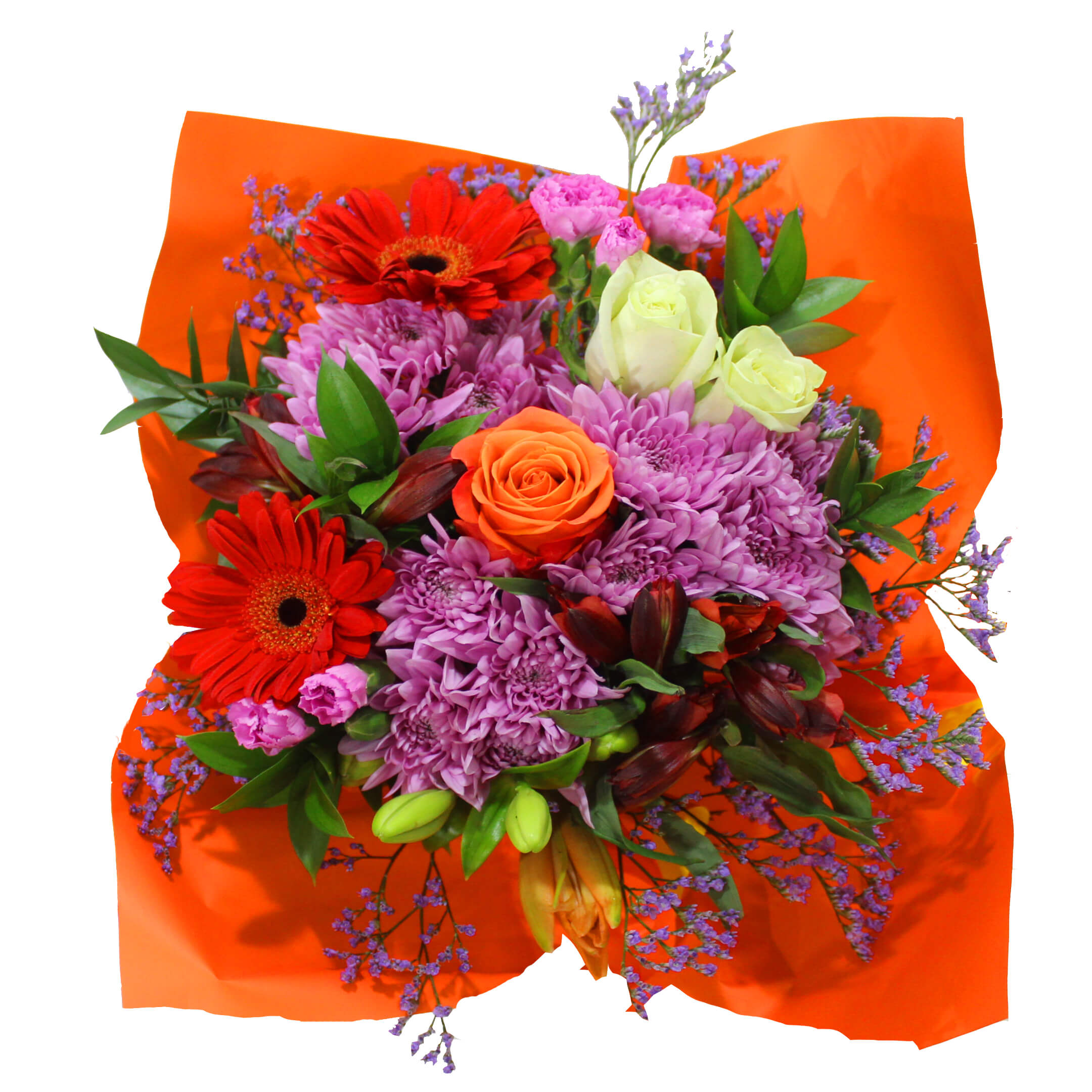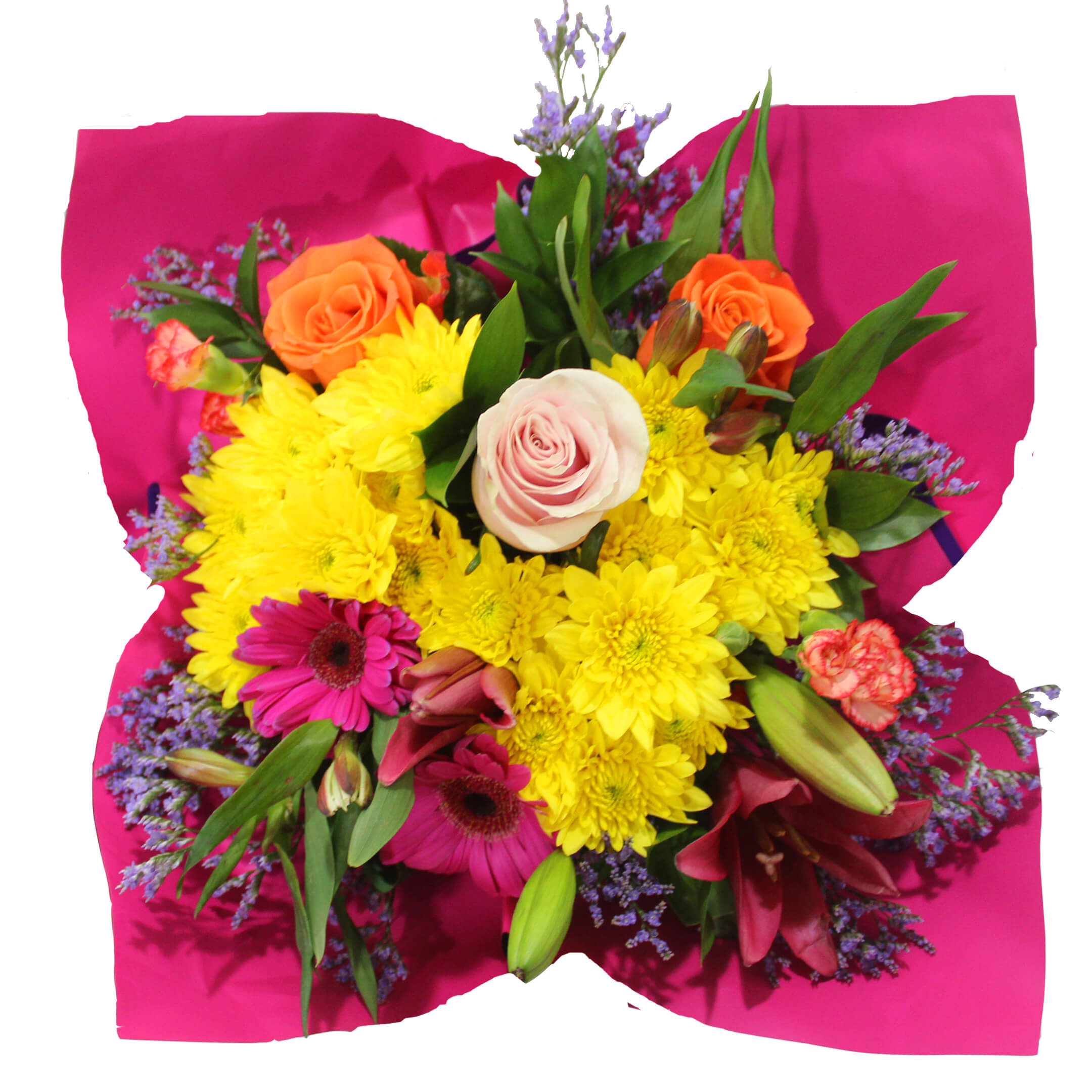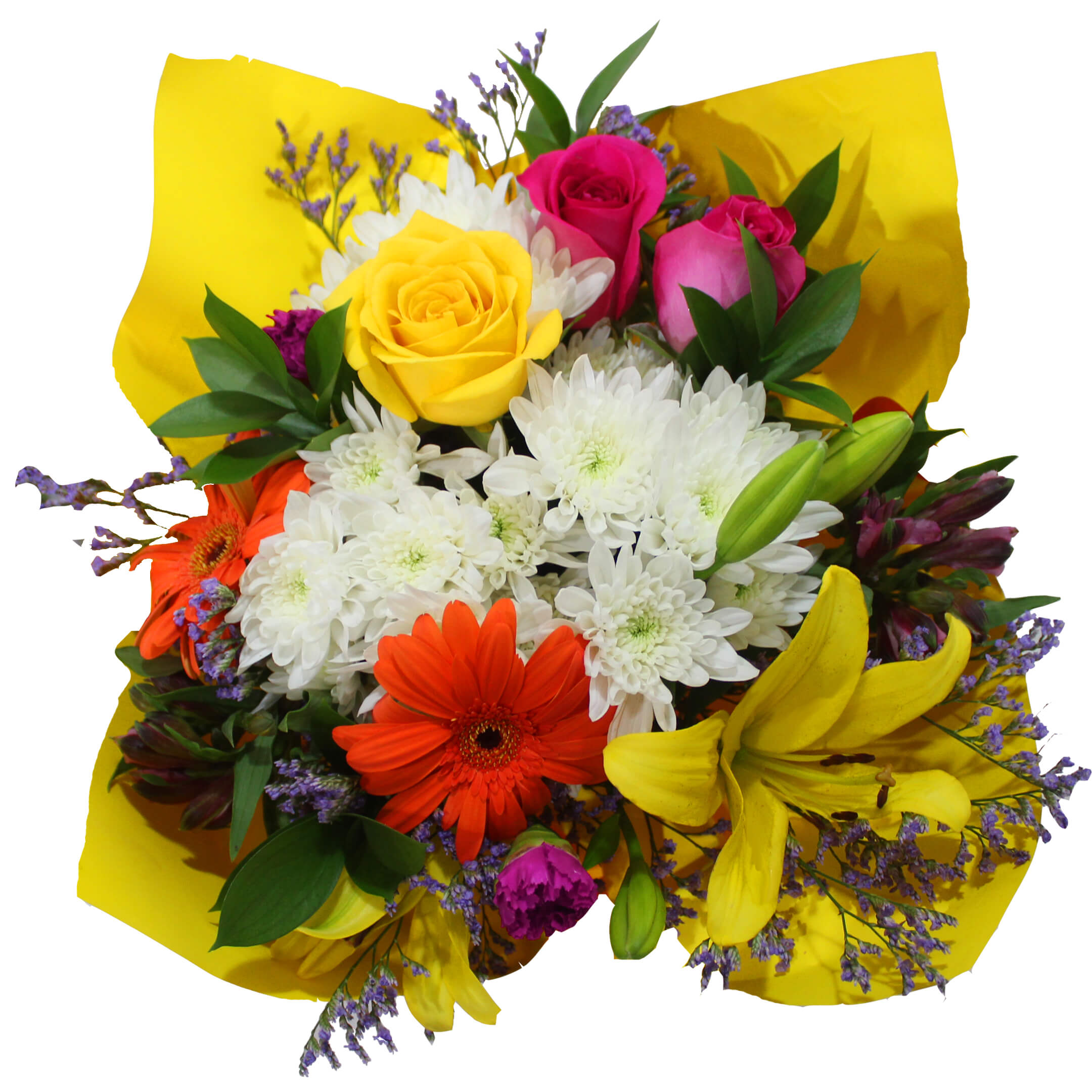 Beautiful mix of: 3 Roses, 2 Gerberas, 1 Lily, 3 Cushion, 2 Carnation/Mini Carnation, 2 Alstromeria, 2 Limonium/Caspia, 5 Ruscus, Clear sleeve+Wrap+food+UPC