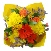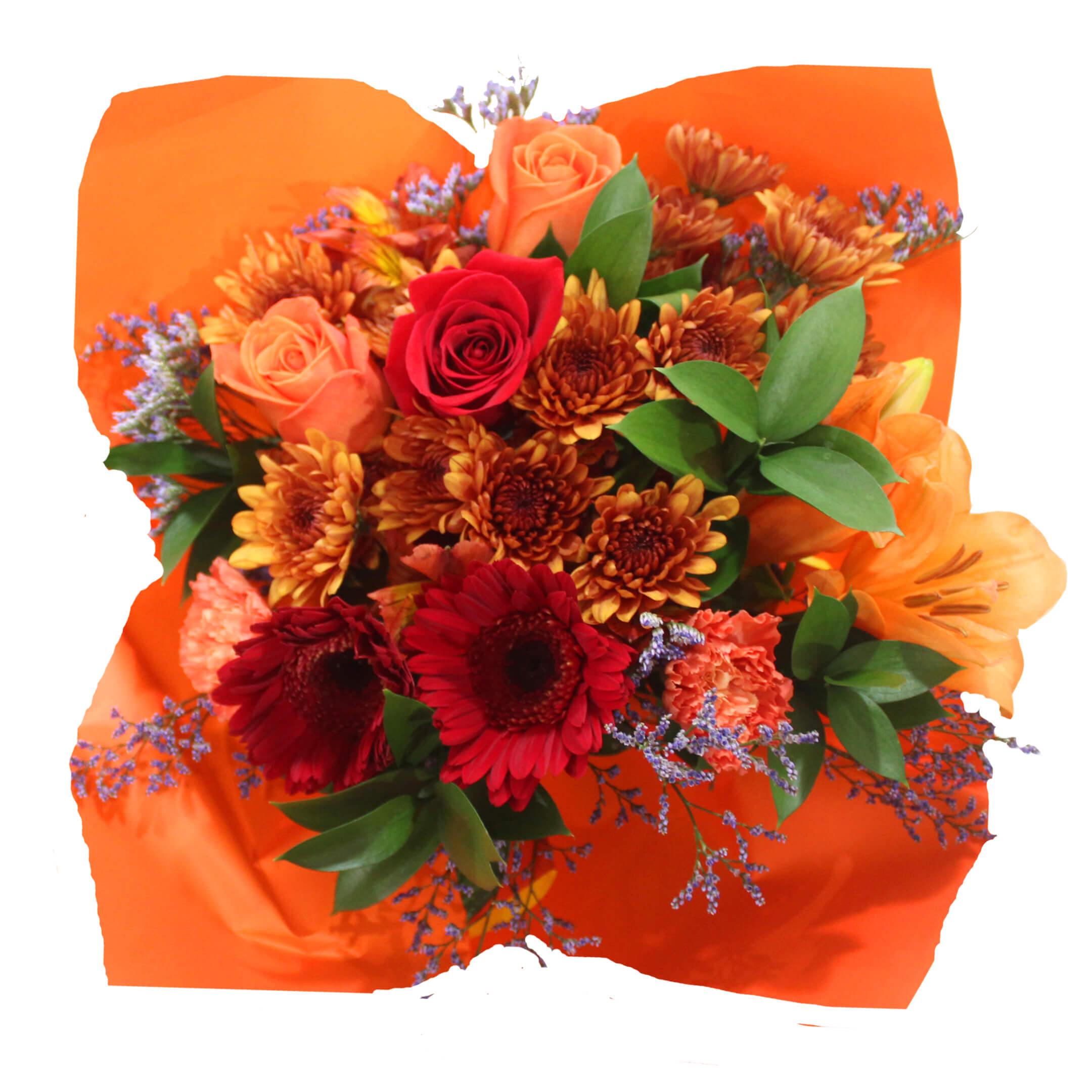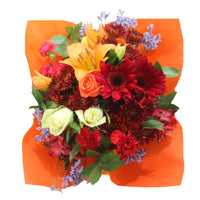 Beautiful mix of: 3 Roses, 2 Gerberas, 1 Lily, 3 Cushion, 2 Carnation/Mini Carnation, 2 Alstromeria, 2 Limonium/Caspia, 5 Ruscus, Clear sleeve+Wrap+food+UPC