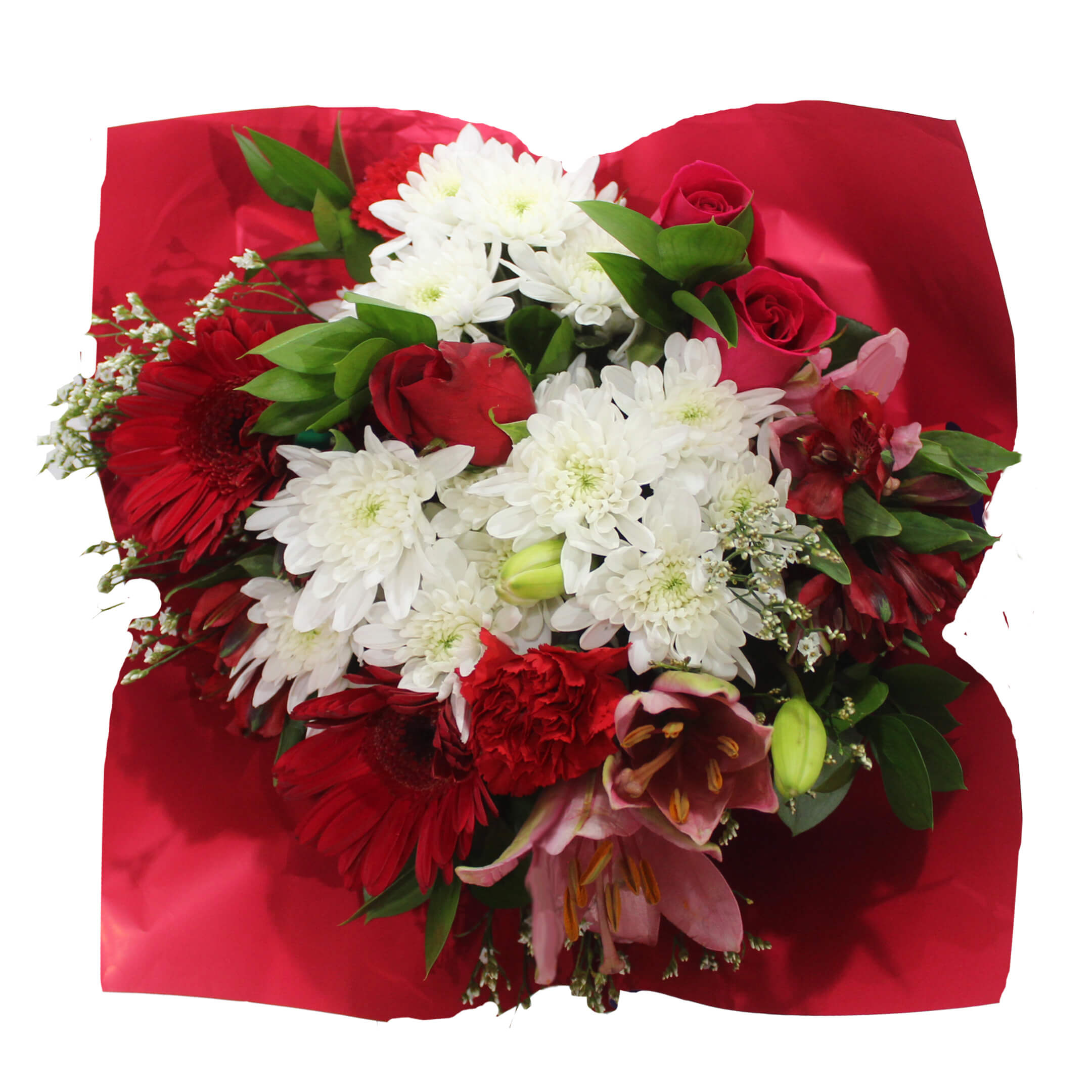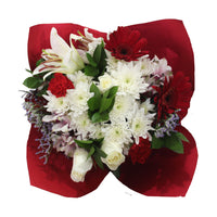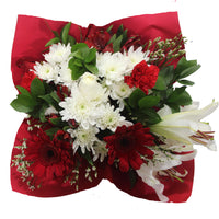 Beautiful mix of: 3 Roses, 2 Gerberas, 1 Lily, 3 Cushion, 2 Carnation/Mini Carnation, 2 Alstromeria, 2 Limonium/Caspia, 5 Ruscus, Clear sleeve+Wrap+food+UPC