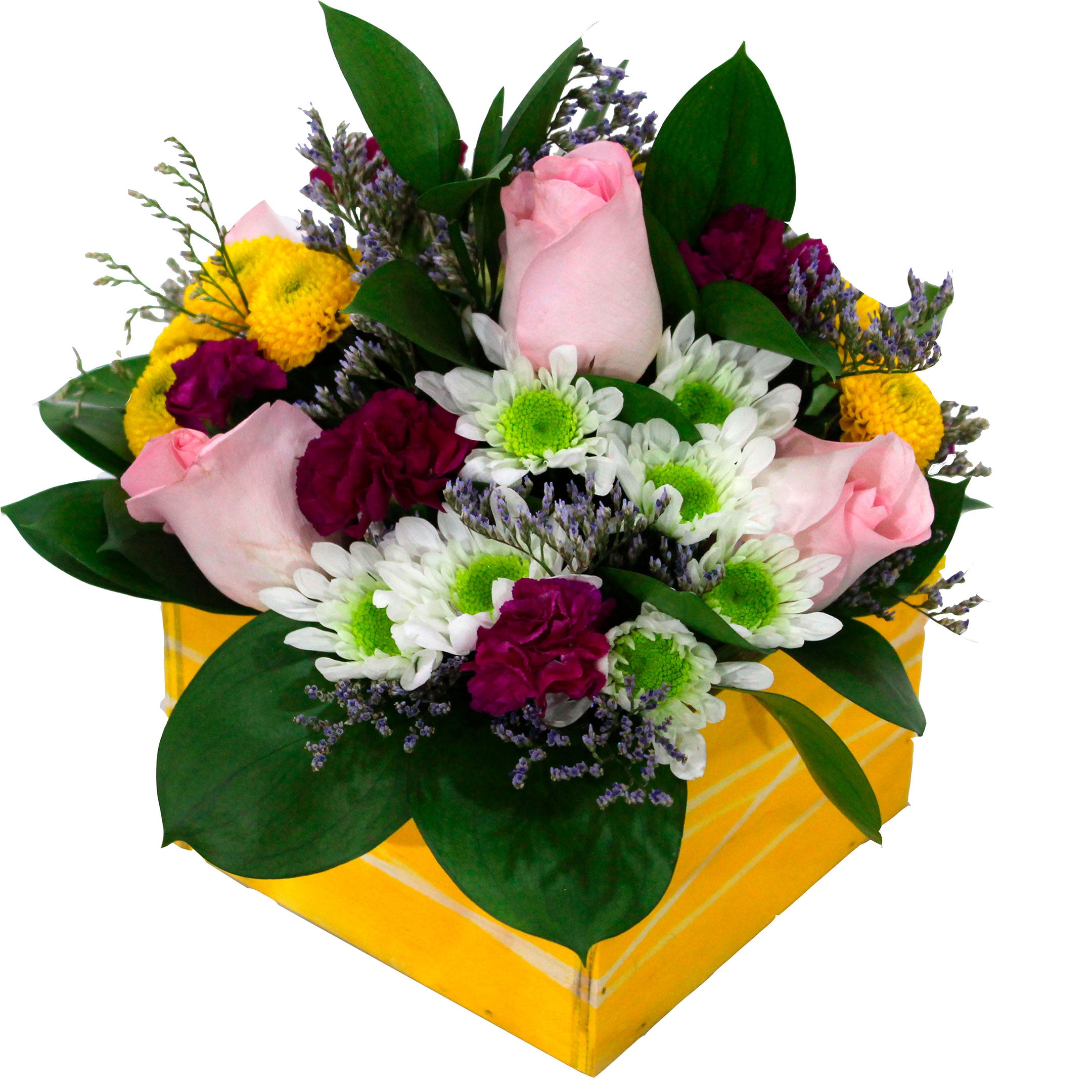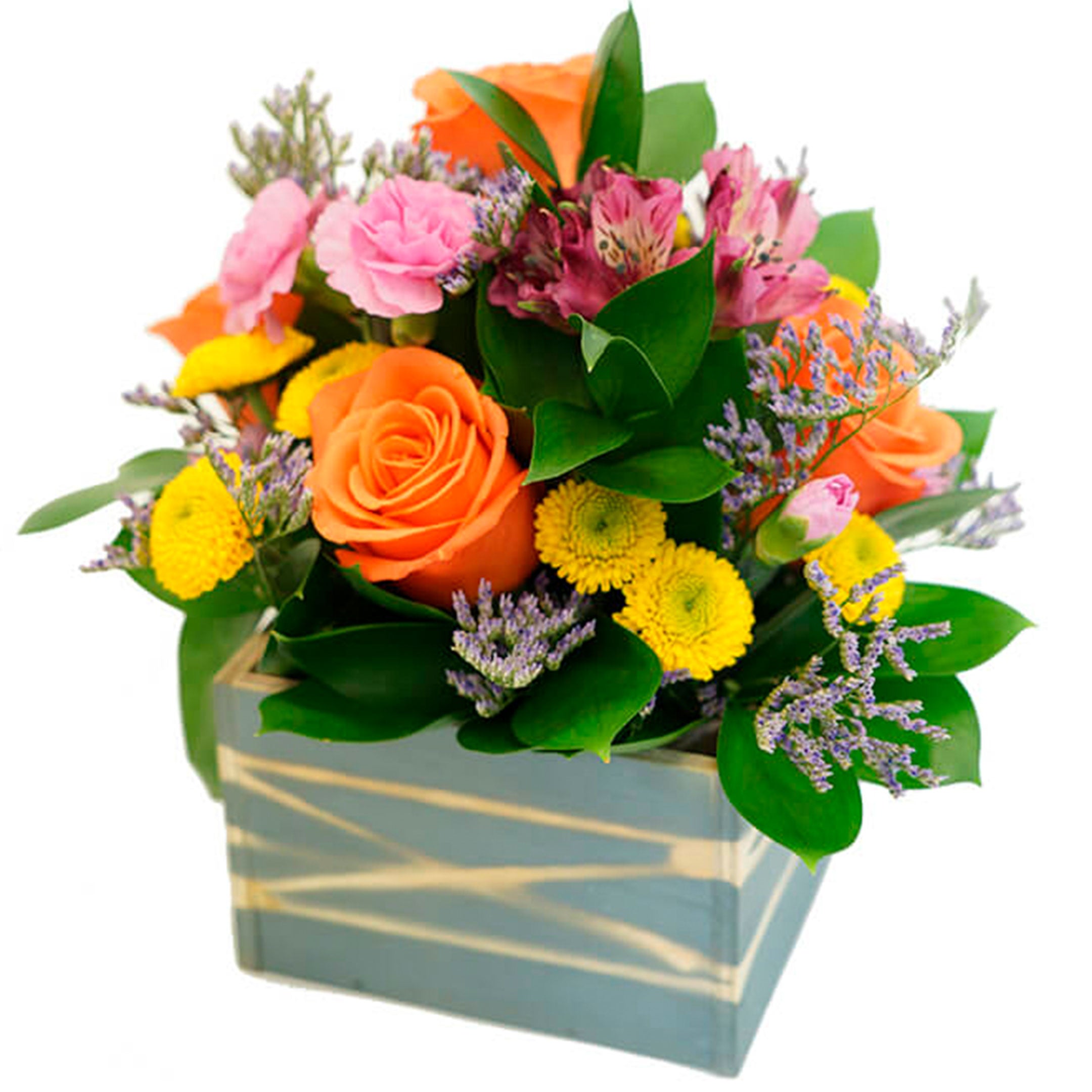 5 Roses, 1 Stem Alstroemeria/10 Button Poms, 10 Micropoms/ 3 Mini Carnation, 4 Caspia, 12 Ruscus, Special Wood Container with a Fun Paint in a seasonal color, Plastic Liner.