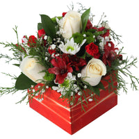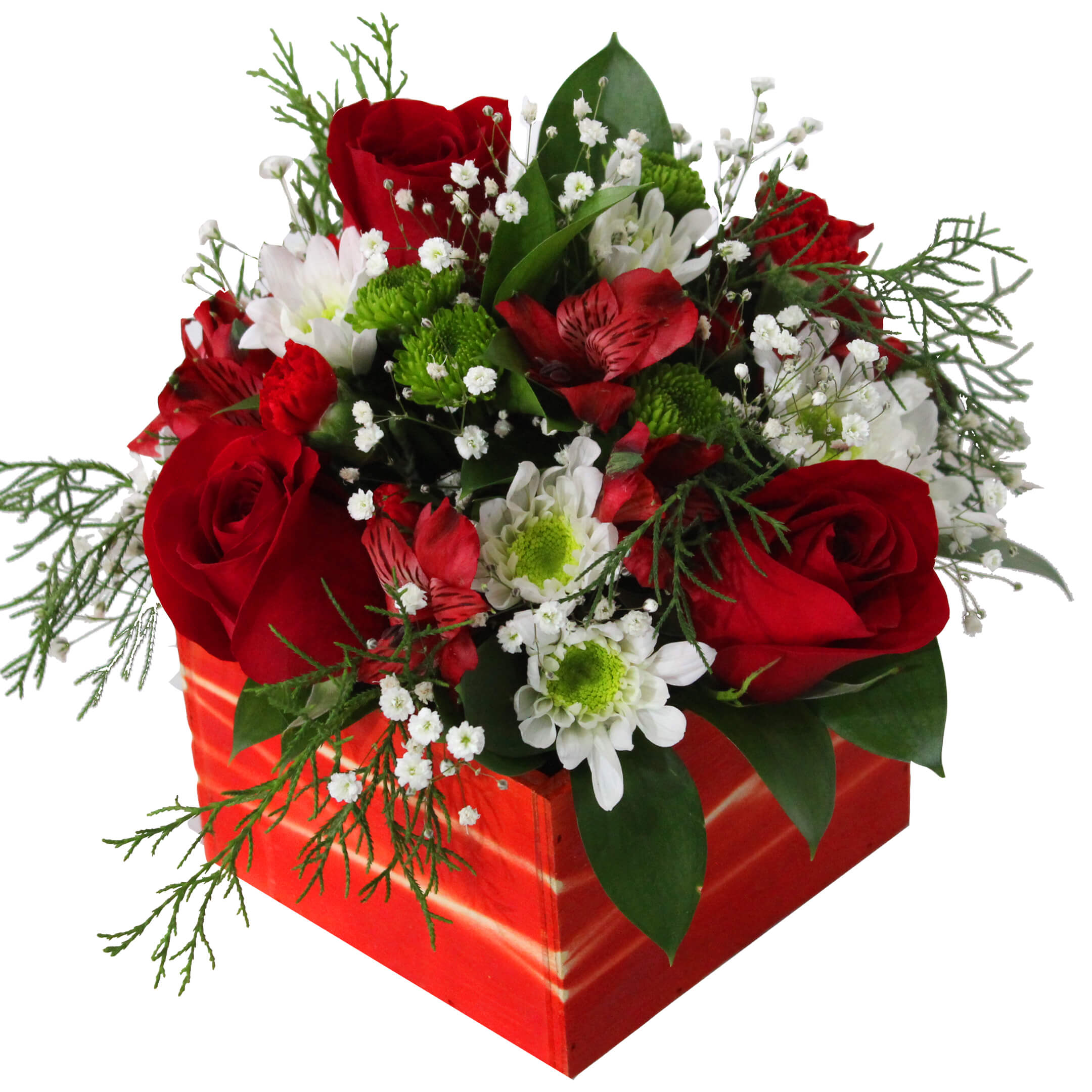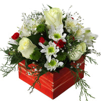 5 Roses, 1 Stem Alstroemeria/10 Button Poms, 10 Micropoms/ 3 Mini Carnation, 4 Caspia, 12 Ruscus, Special Wood Container with a Fun Paint in a seasonal color, Plastic Liner.