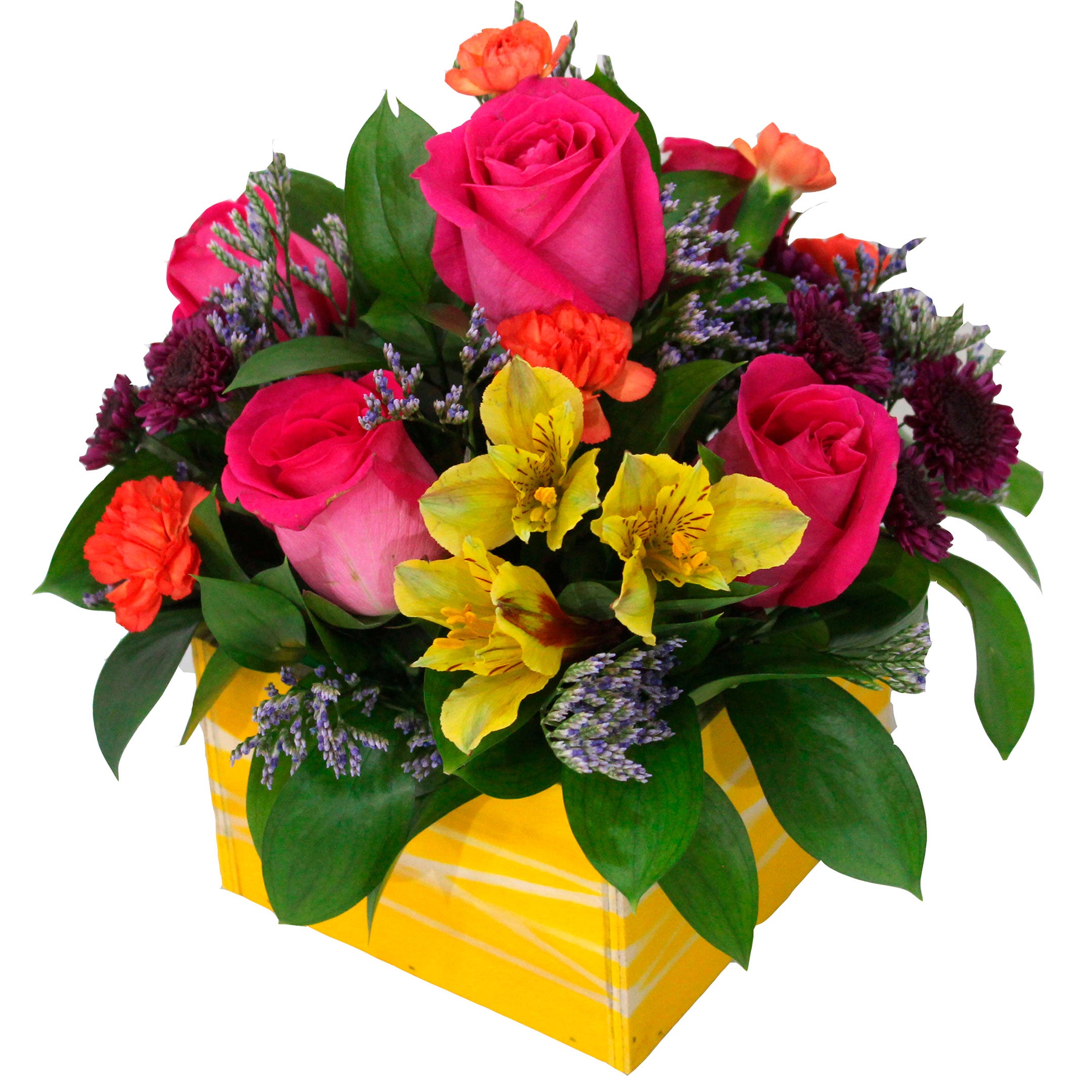 5 Roses, 1 Stem Alstroemeria/10 Button Poms, 10 Micropoms/ 3 Mini Carnation, 4 Caspia, 12 Ruscus, Special Wood Container with a Fun Paint in a seasonal color, Plastic Liner.