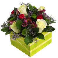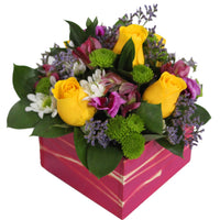 5 Roses, 1 Stem Alstroemeria/10 Button Poms, 10 Micropoms/ 3 Mini Carnation, 4 Caspia, 12 Ruscus, Special Wood Container with a Fun Paint in a seasonal color, Plastic Liner.