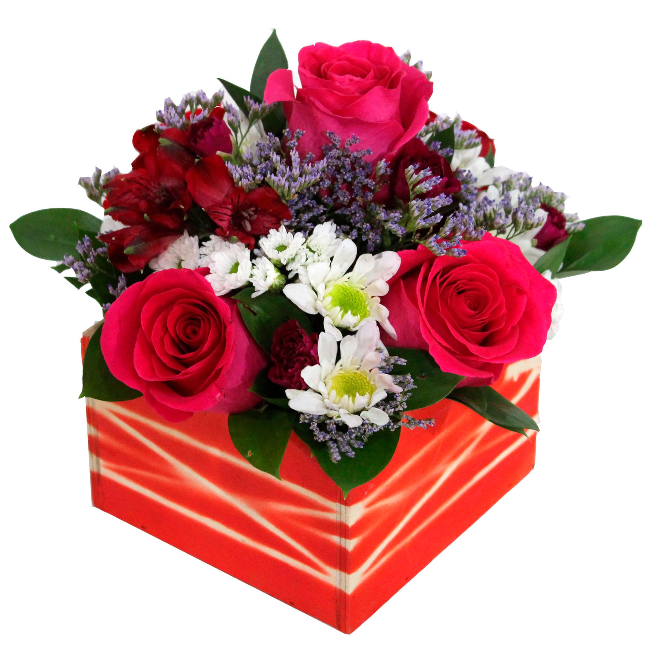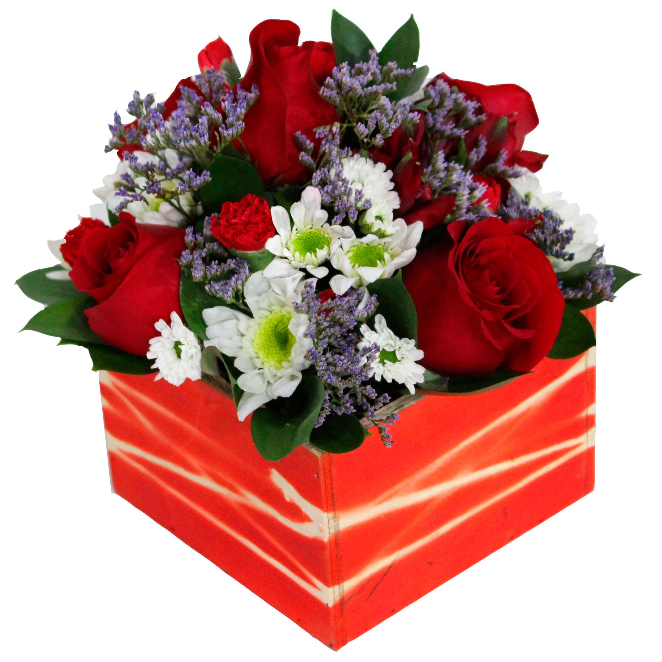 5 Roses, 1 Stem Alstroemeria/10 Button Poms, 10 Micropoms/ 3 Mini Carnation, 4 Caspia, 12 Ruscus, Special Wood Container with a Fun Paint in a seasonal color, Plastic Liner.