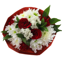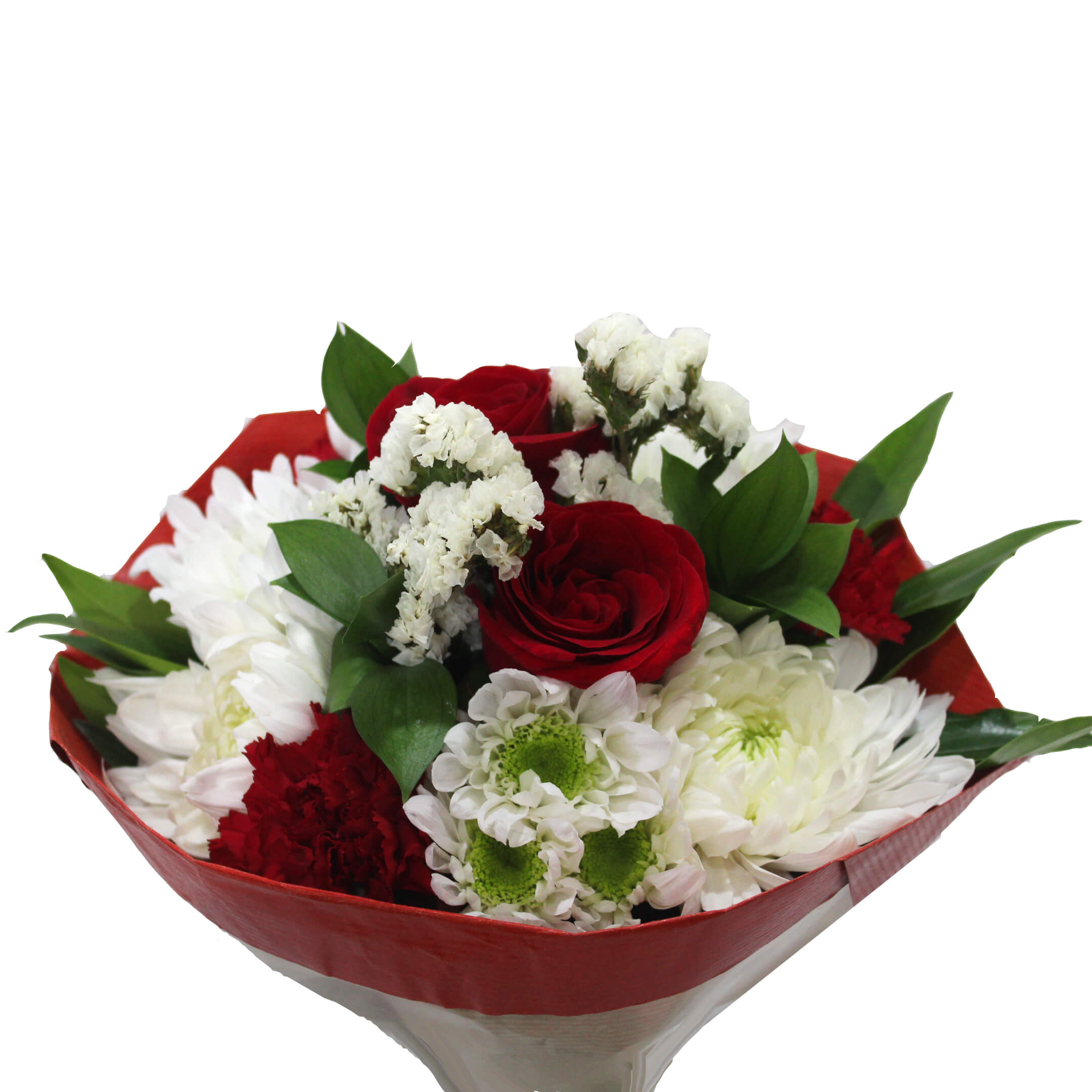 2 Roses,3 Disbuds, 3 Novelty Poms/Daisy, 2 Fillers, 3 Dianthus/Carnation, 2 Cocculus, 3 Ruscus Paper deco sleeve+Food+UPC (55 CM presentation bouquet) + rope