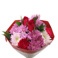 2 Roses,3 Disbuds, 3 Novelty Poms/Daisy, 2 Fillers, 3 Dianthus/Carnation, 2 Cocculus, 3 Ruscus Paper deco sleeve+Food+UPC (55 CM presentation bouquet) + rope