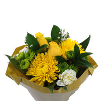 2 Roses,3 Disbuds, 3 Novelty Poms/Daisy, 2 Fillers, 3 Dianthus/Carnation, 2 Cocculus, 3 Ruscus Paper deco sleeve+Food+UPC (55 CM presentation bouquet) + rope