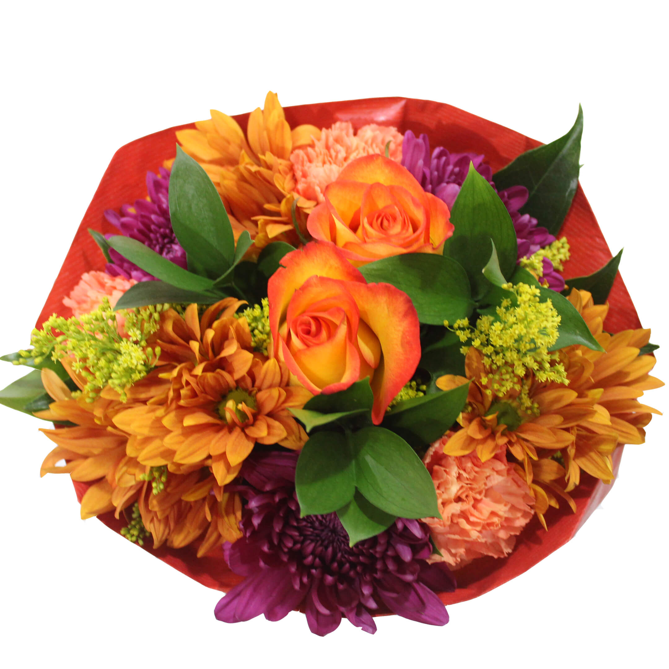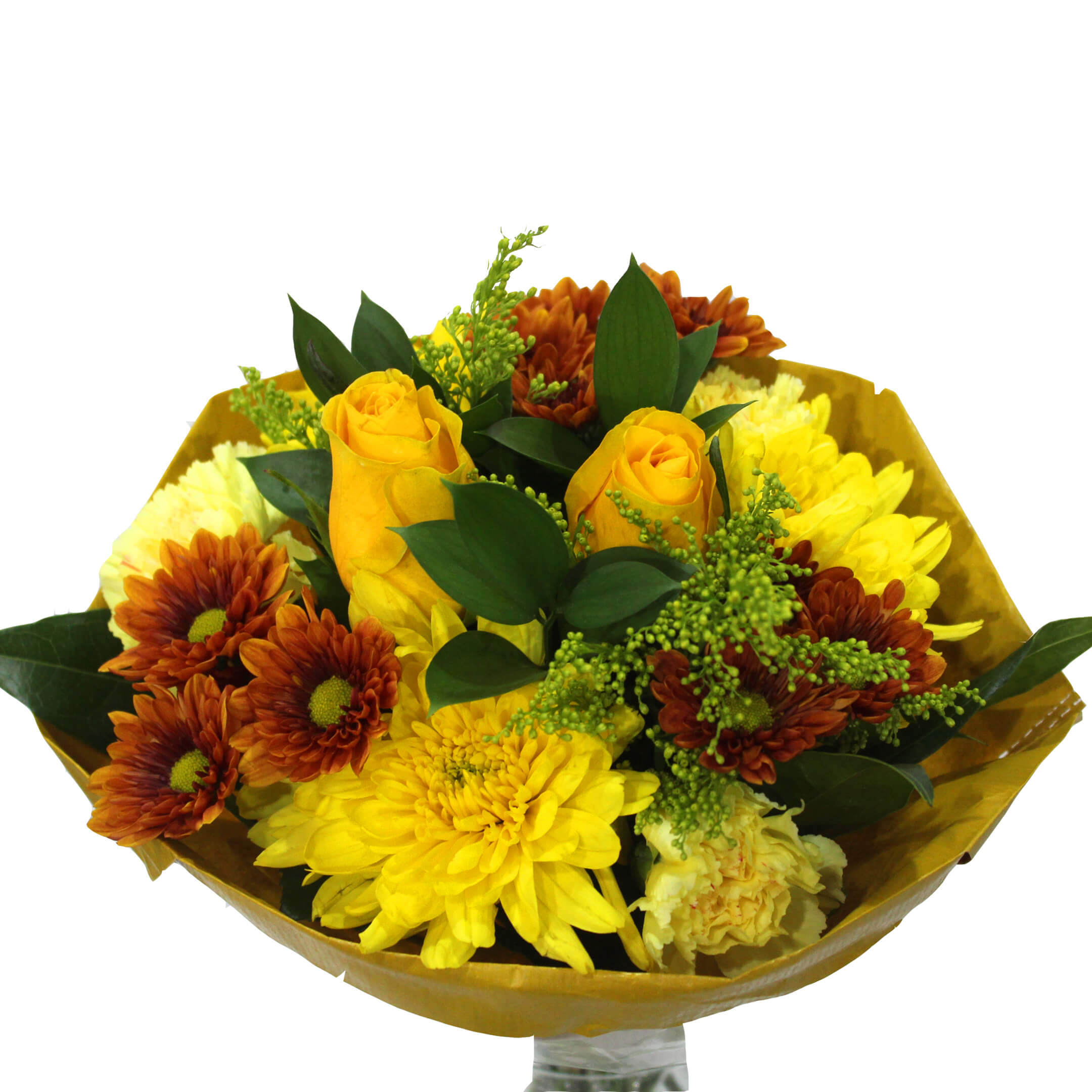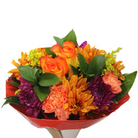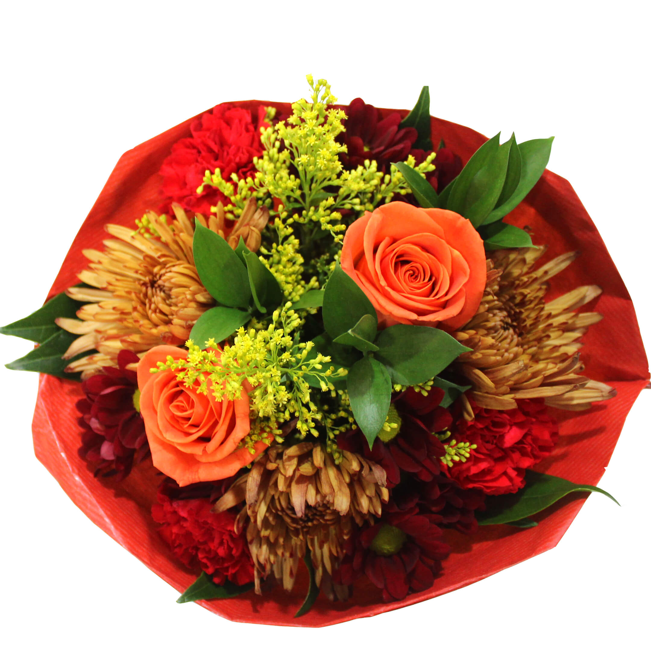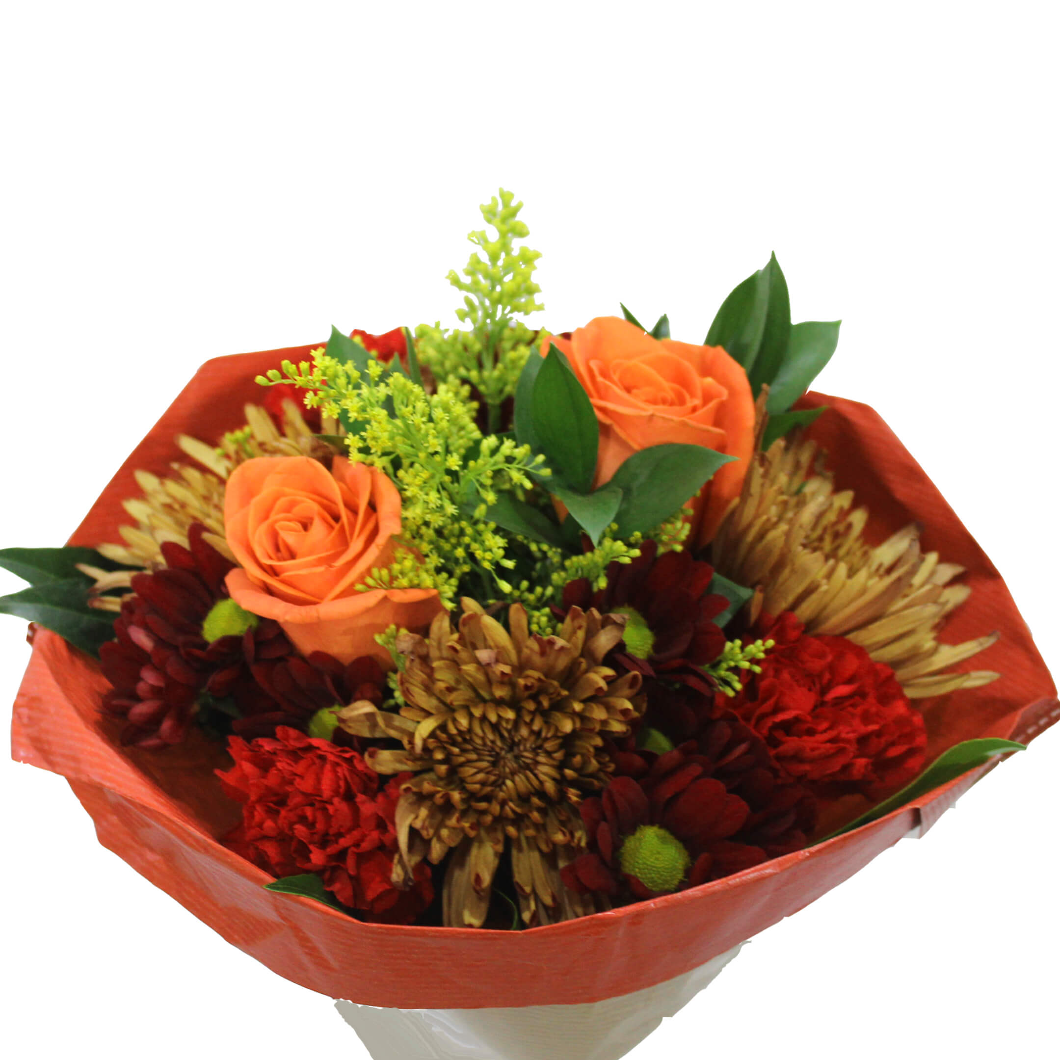 2 Roses,3 Disbuds, 3 Novelty Poms/Daisy, 2 Fillers, 3 Dianthus/Carnation, 2 Cocculus, 3 Ruscus Paper deco sleeve+Food+UPC (55 CM presentation bouquet) + rope