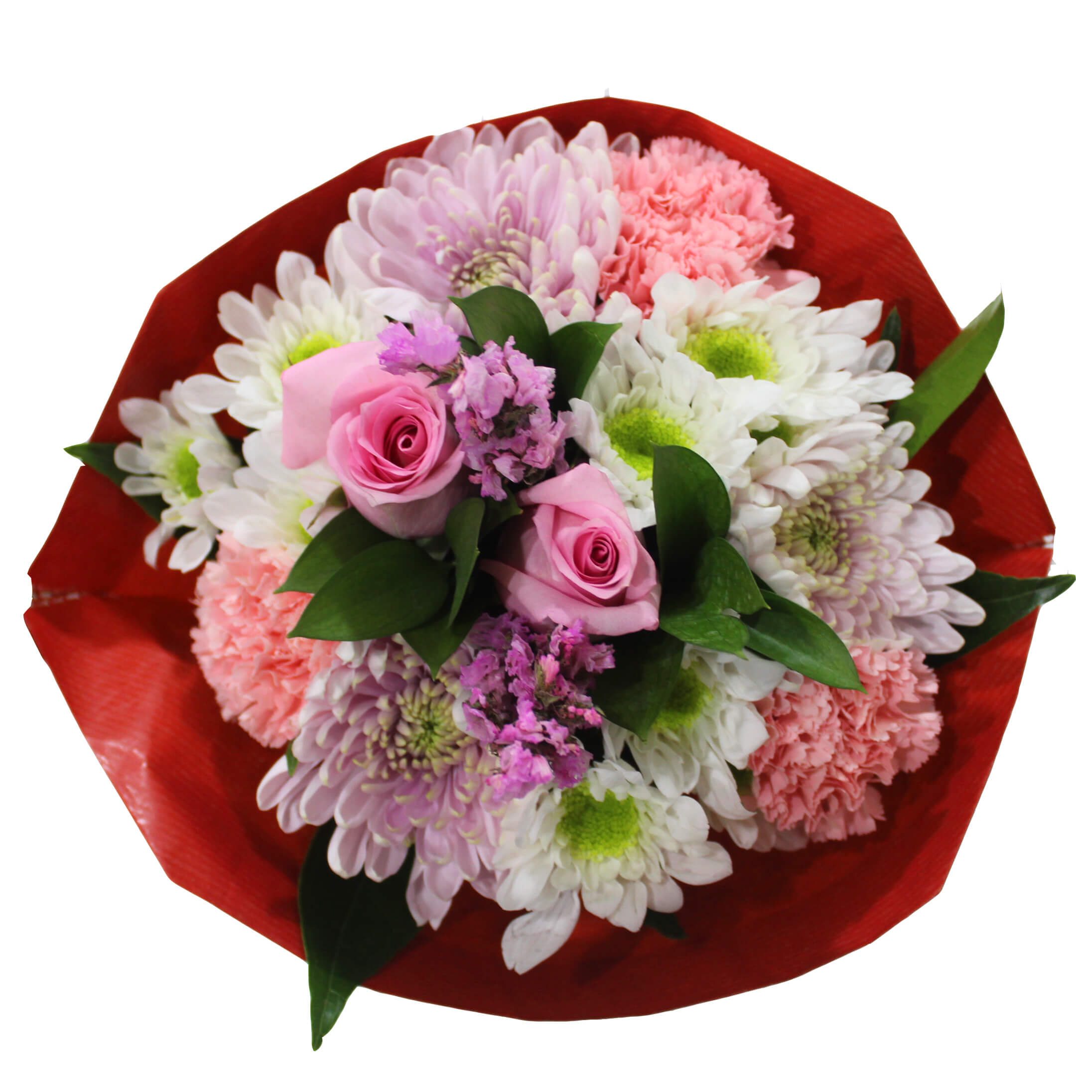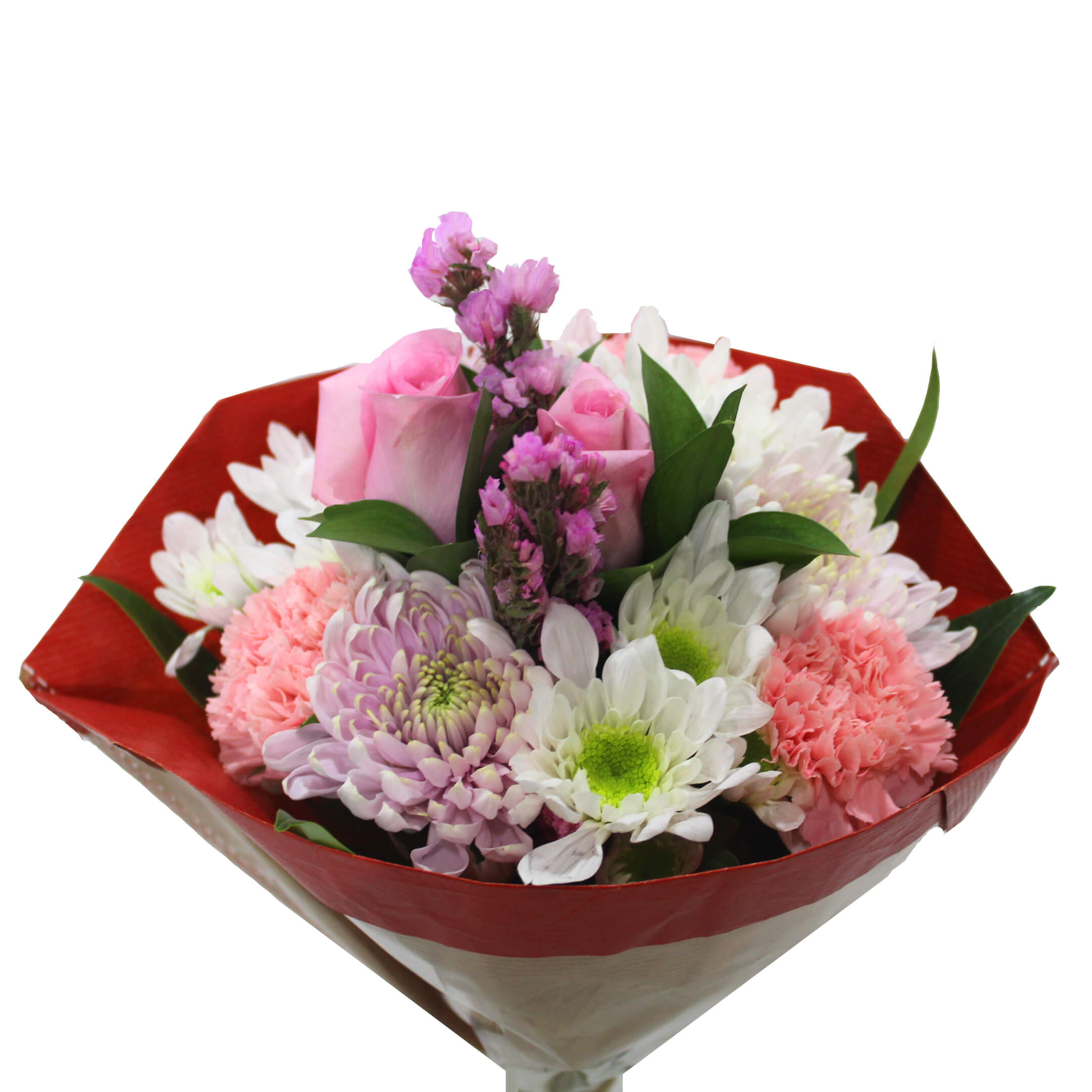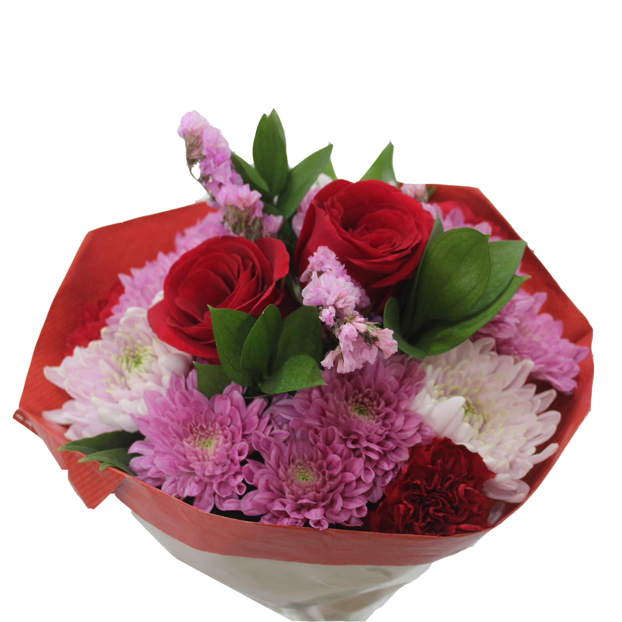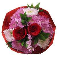 2 Roses,3 Disbuds, 3 Novelty Poms/Daisy, 2 Fillers, 3 Dianthus/Carnation, 2 Cocculus, 3 Ruscus Paper deco sleeve+Food+UPC (55 CM presentation bouquet) + rope